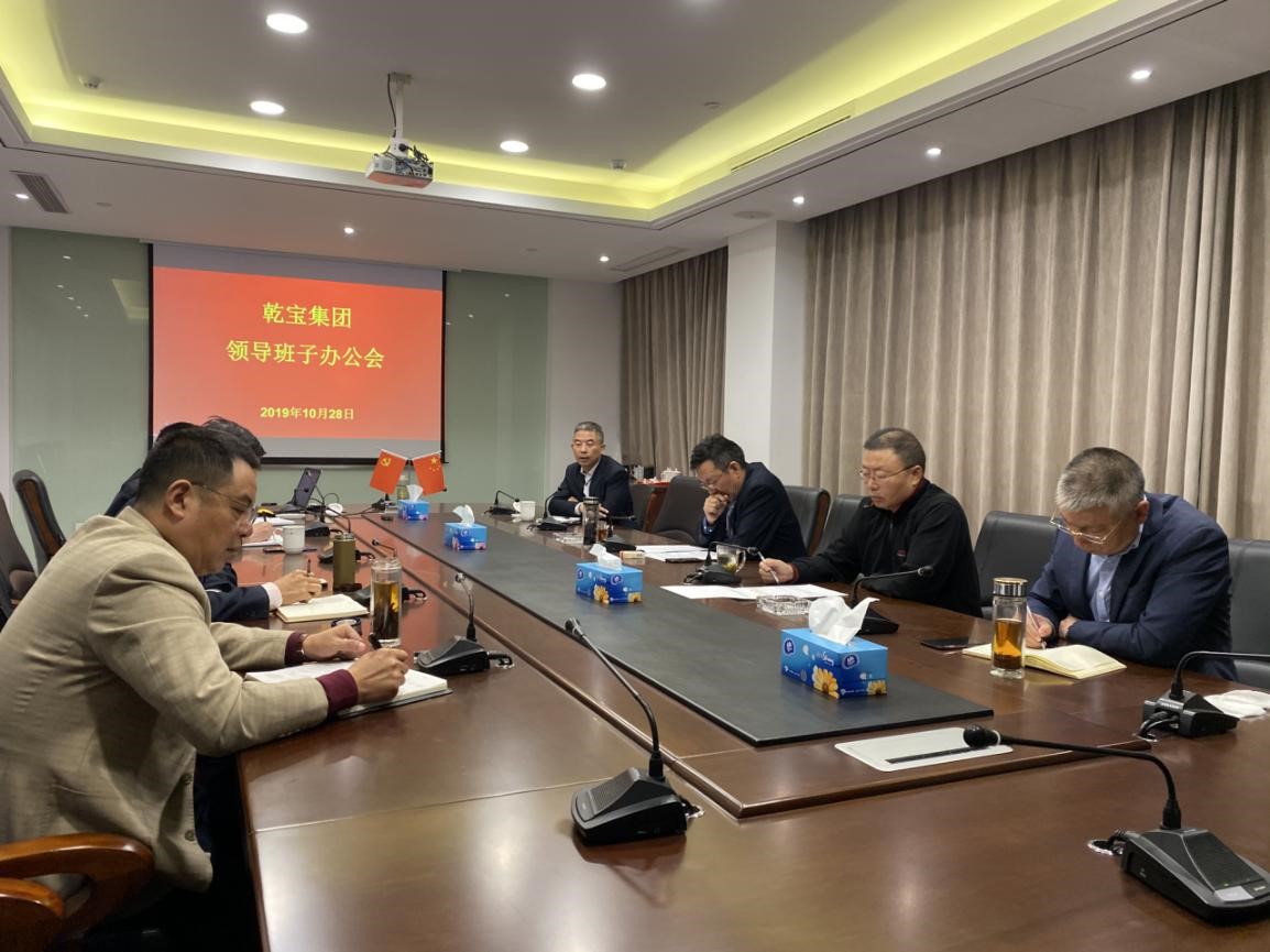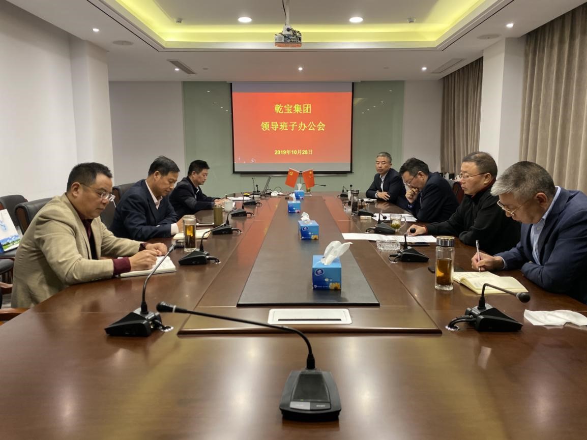 ? ? ? ?2019年10月28日,乾寶集團在總部召開領(lǐng)導(dǎo)班子辦公會。董事長王躍程、副董事長朱波、執(zhí)行總裁王翼寧、副總裁許建華、副總裁孟憲考、天堂美公司總經(jīng)理馬向農(nóng)、乾寶生物科技公司總經(jīng)理丘東、辦公室主任陳建飛參加會議。