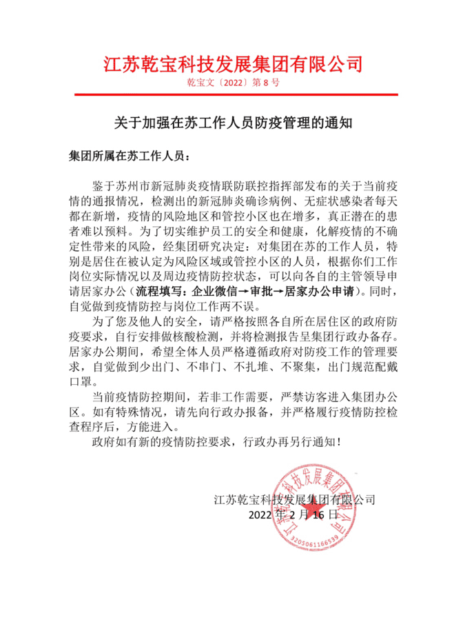 疫情就是命令,防控就是責(zé)任。蘇州市“2·13”新冠肺炎疫情的突發(fā),牽動著無數(shù)人的心。江蘇乾寶科技發(fā)展集團(以下簡稱乾寶集團)上下高度重視,迅速行動起來,嚴(yán)格落實蘇州市委市政府和蘇州市新冠疫情防控指揮部,以及屬地的各項疫情防控要求,積極采取有效措施同心戰(zhàn)疫,確保員工群眾生命健康安全。