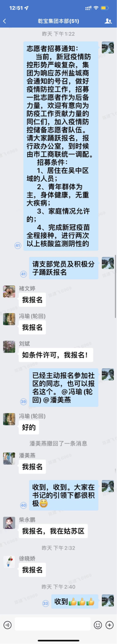 2月18日,集團總部發(fā)出“抗疫志愿者招募通知”,黨員和入黨積極分子率先積極響應(yīng),起到了良好的帶頭示范作用。在蘇的集團企業(yè)板塊和太湖書院各位同仁也紛紛踴躍報名,迅速組建起了一支抗疫志愿者隊伍。