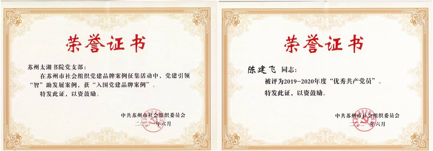 太湖書院黨支部自成立以來,始終堅持以習 近平新時代中國特色社會主義思想為指導,在蘇州市社會組織黨委的領導下,不斷加強黨的建設,凝聚黨員,引領群眾,促進內(nèi)涵發(fā)展,同時立足書院自身實際,充分發(fā)揮智庫功能優(yōu)勢,探索出一條“黨建+智庫”的民非社會組織基層黨建新模式。在6月份蘇州市社會組織黨委舉辦的慶祝建黨100周年暨“紅社發(fā)布”活動上,書院黨支部“黨建引領,‘智’助發(fā)展”案例成功入圍百個社會組織黨建品牌案例,中共太湖書院黨支部被評為“先進基層黨組織”,支部宣傳委員陳建飛同志被評為“優(yōu)秀共產(chǎn)黨員”。