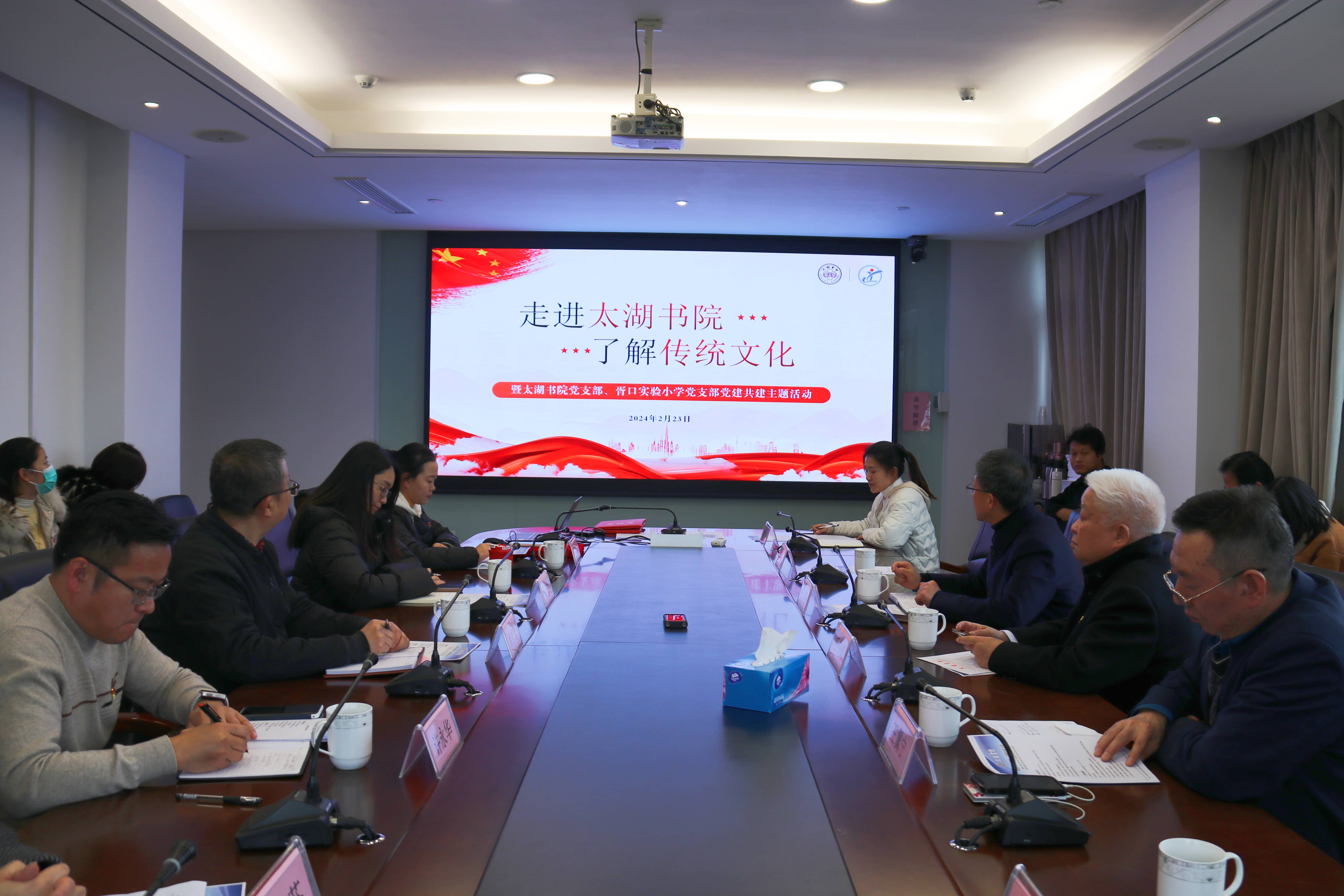 2024年2月23日下午,蘇州太湖書院黨支部聯(lián)合吳中區(qū)胥口實驗小學黨支部,在太湖書院共同舉辦“走進太湖書院,了解傳統(tǒng)文化——暨蘇州太湖書院黨支部、胥口實驗小學黨支部黨建共建主題活動”。胥口實驗小學黨支部書記柳永忠、副書記許永華等全體黨員,太湖書院黨支部首任書記丘亮輝,太湖書院黨支部副書記徐曉嬌等黨員以及入黨積極分子參加了本次活動,江蘇乾寶集團總裁王翼寧,太湖書院執(zhí)行院長王建明以及太湖書院陶瓷博物館館長寧盛昌等熱情接待,并列席了會議。